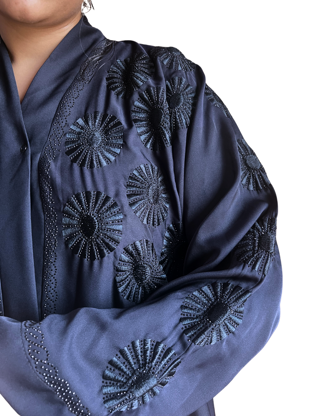 Noor's Dark Blue Abaya for Women – Luxury Modest Dress with Embroidered Floral Motifs & Scalloped Detailing