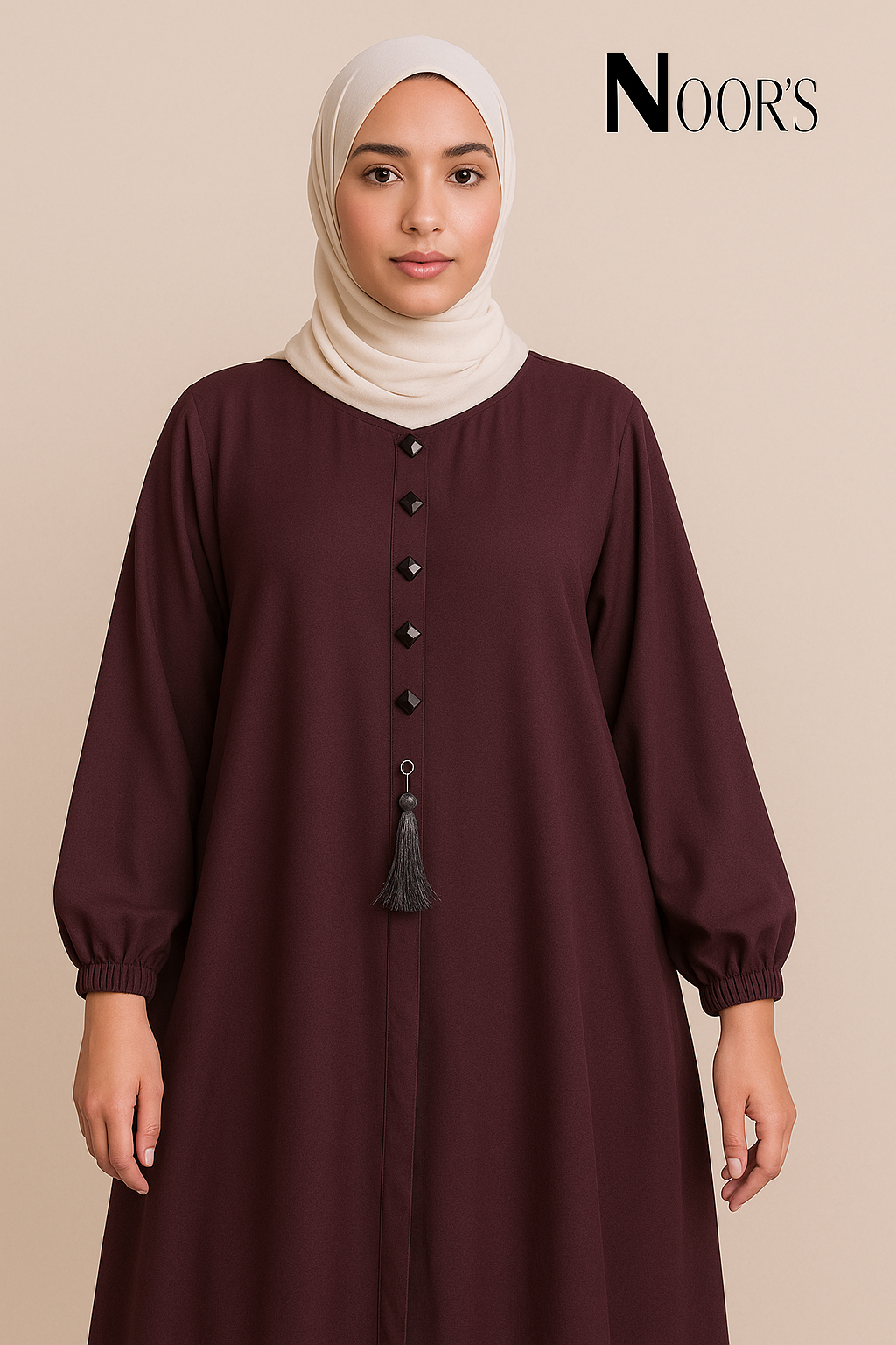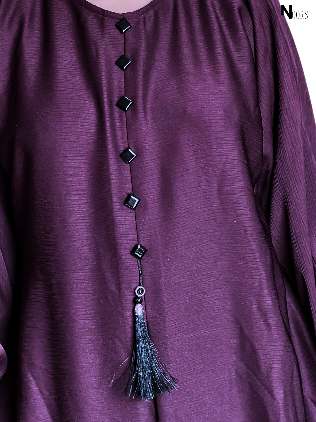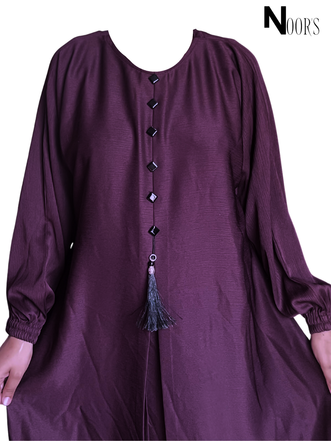 Noor's Designer Abaya – Plum Modest Dress with Pleats, Buttons & Tassel Charm