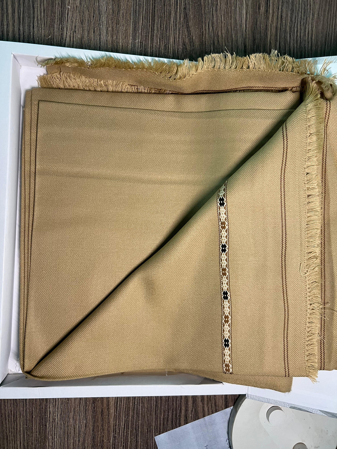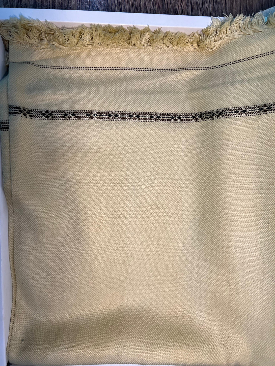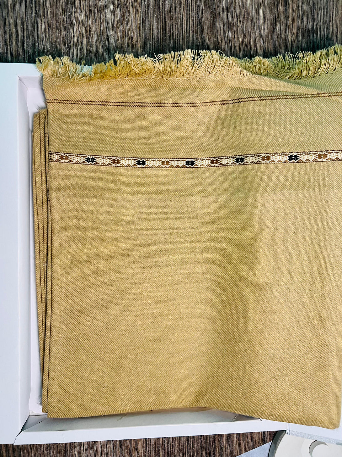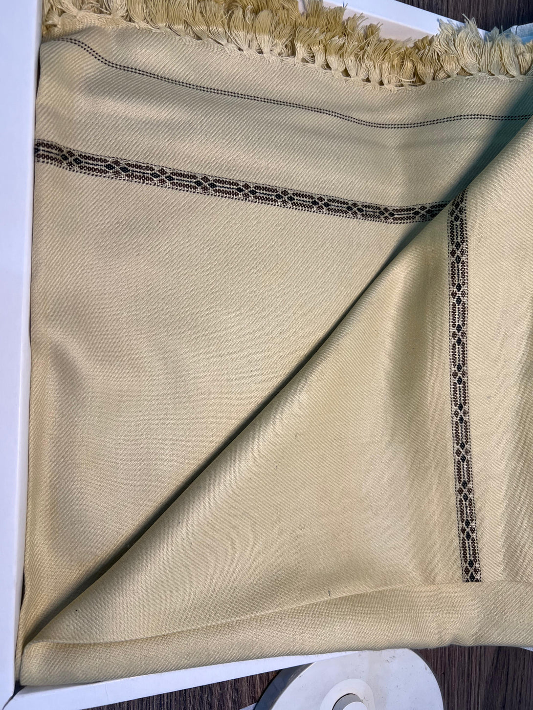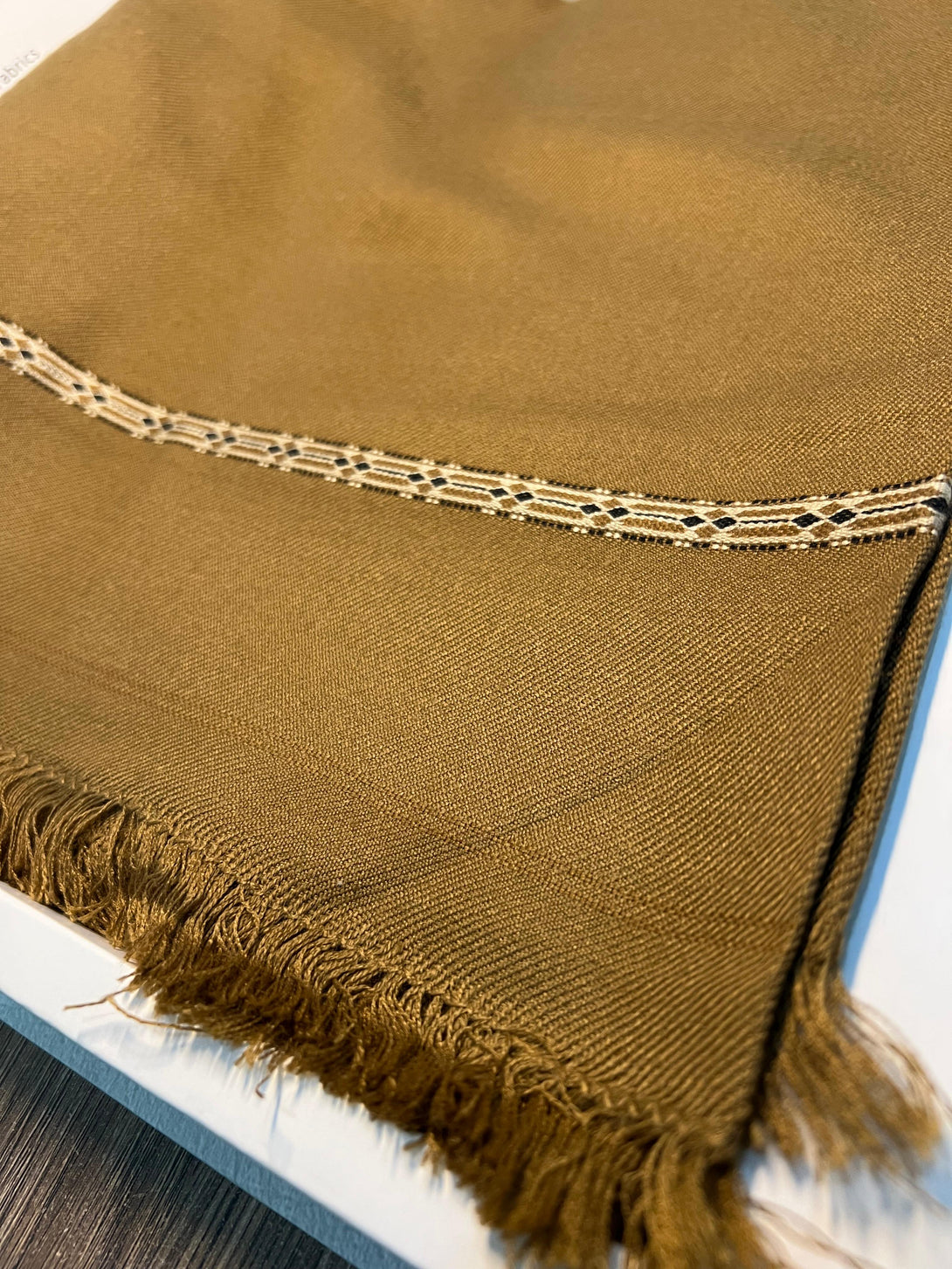 Its traditional woven border design in brown and black enhances its classic appeal, making it perfect for both casual and formal winter occasions.
